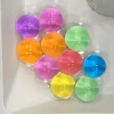 Description: Set of four colourful rigid plastic rattles filled in several shapes, with rattling balls.